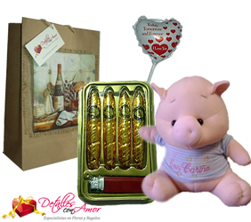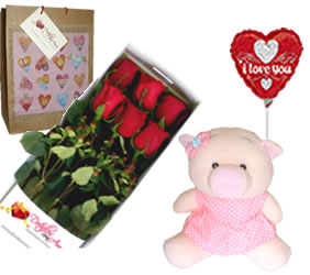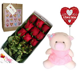 Caja de 09 rosas naturales + globo + chanchita coqueta