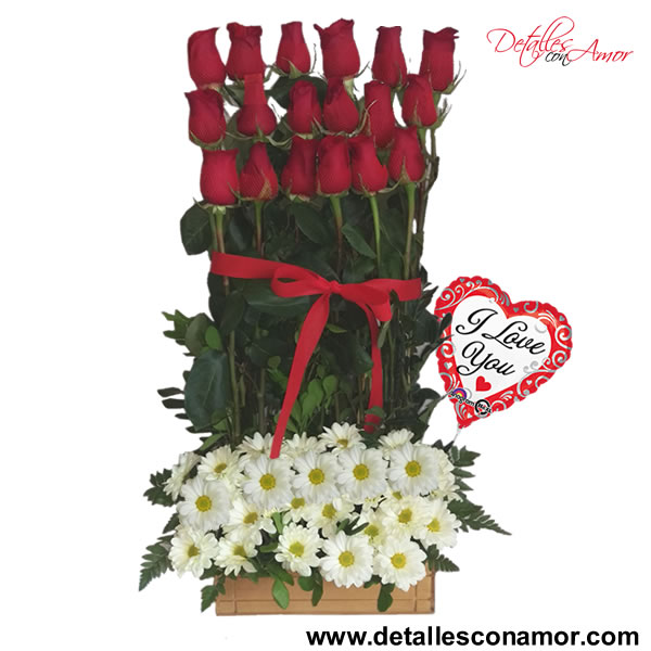 Un Arreglo floral con 18 rosas rojas y fino follaje según estación en base tipo madera. Incluye globo de amor.