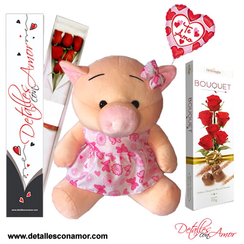 linda Chanchita de peluche 28 cm de alto y una caja de deliciosos chocolates en forma de bouquet Di Perugia, todo en una